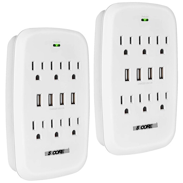 OutletOutletOutlet5 Core is a trusted brand across 56 different countriesAs a professional manufacturer of small appliances, we are committed to building best products that add convenience, and enhanced experiences to our valued customers.With a dedication to quality and service, we continue to push for excellence in the industry.6 Outlet Extender Surge Protector with 4 USB PortsMulti Surge Protected OutletsThe multi-functional wall tap plug features 6 surge-protected outlets and 4 USB ports to save space and USB adapters, keeps everyday electronic devices safely plugged in and fully charged with it, so you can efficient charge 6 AC devices and 4 USB devices simultaneously Package Includes : 2 Pieces Surge ProtectorOutletOutletOutlet6 Outlet & 4 USB PortsPlug and Play Wall Outlet Expander- Simply plug and use, the outlet extender wall mount surge protector extends 2 wall outlets to 6 outlets and 4 USB ports; USB wall outlet allows you to charge 6 125v AC devices and up to 4 USB devices simultaneouslySpecificationsInput Voltage: AC 100-120V; 60HzMax. Power Rating: 15A/1875WUSB Port Output: DC5V, Total 4.8ASurge Protection: 900 JoulesCompact & Travel ReadySmall Size 6.4 ? 1.2 ? 4.2 in , and light wight very easy to carry and store, save space of your suitcase when you are traveling.OutletOutletOutlet900J Surge Protection900 Joule energy rating provides superior protection of all your electronics.The indicator light assures connected electronics are protected from surges or spikes.Fast Smart USB Charging PortsHigh-speed USB ports automatically detect charging devices and deliver optimal charging speed, USB-A up to 2.4A per port Total 4.8A.Design with Stabilizing PostThe screw included can be used to secure it on duplex outlet. The plastic prong at the bottom is for reinforcement purpose also. For USB receptacle and GFCI outlet, the plastic prong needs to be cut off before using. Also, your cell phone could be put on the top phone holder conveniently when charging.