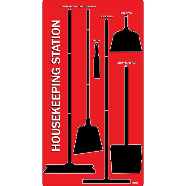5S Housekeeping Shadow Board Version 3 Our Housekeeping Stations will quickly allow you to visually organize your brooms and housekeeping supplies.Visually see if items are missing with our 5S Shadows Boards* Eliminate searching for tools* Everything will have a place.* Everyone will know the standard for returning tools.Board SpecificationsBoard Dimensions: 74 inches x 46 inches wideCorners: 1/2 inch Rounded Corners for SafetyMounting Holes: 4 3/8 inch mounting holesBoard Material: 3mm Thick Aluminum with white backingHardware Included to hang toolsBroom Kit Incuded