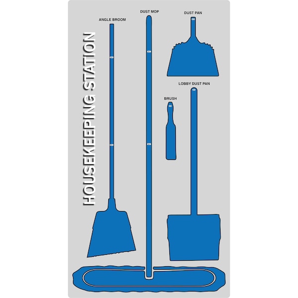 5S Housekeeping Shadow Board Version 4 Our Housekeeping Stations will quickly allow you to visually organize your brooms and housekeeping supplies.Visually see if items are missing with our 5S Shadows Boards* Eliminate searching for tools* Everything will have a place.* Everyone will know the standard for returning tools.Board SpecificationsBoard Dimensions: 75 inches x 46 inches wideCorners: 1/2 inch Rounded Corners for SafetyMounting Holes: 4 3/8 inch mounting holesBoard Material: 3mm Thick Aluminum with white backingHardware Included to hang toolsBroom Kit Included