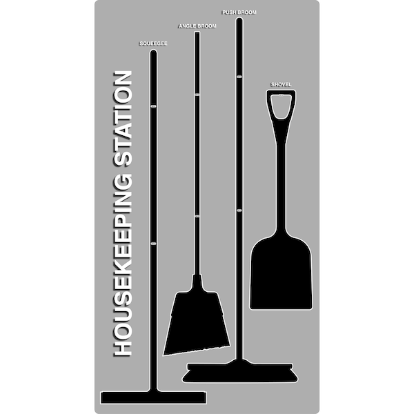 5S Housekeeping Shadow Board Version 6 Our Housekeeping Stations will quickly allow you to visually organize your brooms and housekeeping supplies.Visually see if items are missing with our 5S Shadows Boards* Eliminate searching for tools* Everything will have a place.* Everyone will know the standard for returning tools.Board SpecificationsBoard Dimensions: 71 inches x 42 inches wideCorners: 1/2 inch Rounded Corners for SafetyMounting Holes: 4 3/8 inch mounting holesBoard Material: 3mm Thick Aluminum with white backingHardware Included to hang toolsBroom Kit Included