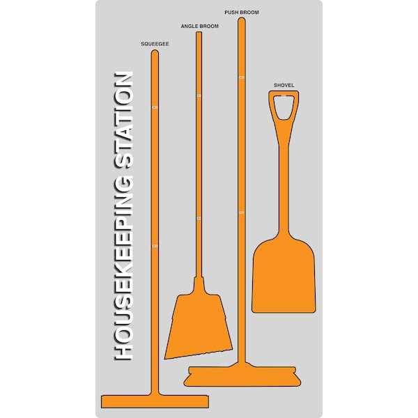 5S Housekeeping Shadow Board Version 6 Our Housekeeping Stations will quickly allow you to visually organize your brooms and housekeeping supplies.Visually see if items are missing with our 5S Shadows Boards* Eliminate searching for tools* Everything will have a place.* Everyone will know the standard for returning tools.Board SpecificationsBoard Dimensions: 71 inches x 42 inches wideCorners: 1/2 inch Rounded Corners for SafetyMounting Holes: 4 3/8 inch mounting holesBoard Material: 3mm Thick Aluminum with white backingHardware Included to hang toolsBroom Kit Included