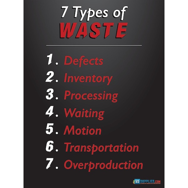 7 Types of Waste Poster Version 17 Types of Waste is the building blocks of all improvement activity. We have designed a 7 Types of Waste that encompasses the major themes of Lean Manufacturing into one image. Use this poster with every workshop that you perform as 7 Types of Waste should be an integral part of every workshop. This poster will improve your effectiveness as a facilitator and serve as a beacon to sustaining Lean Manufacturing.Full Color PosterSize: 24 X 32