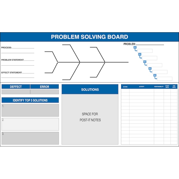 Problem Solving - Fishbone & 5 Why Board Aluminum Dry Erase 72in x 46inOur Fishbone Problem Solving Board is perfect for Root Cause Problem Solving Meetings.This Visual Management Board is made of durable Aluminum and will last for years to come. This can easily mount on a wall or be placed on a stand.Dimensions: 72in wide x 46in heightDry EraseAluminum NO FRAMENon-Magnetic
