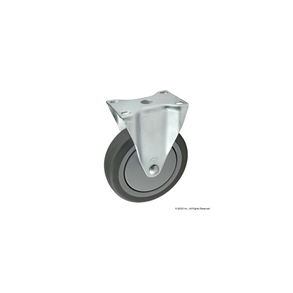 Flange Mount Rigid Caster, Inch, For Profile Type Quad, Wheel Diameter 5 in, Caster Mounting Type Plate, Includes Brakes No, Swivel, Zinc-Plated, Fastener Thread Length Not Applicable, Overall Height 6 1/4 in, Rubber/Steel, 10 Series, 15 Series, 25 Series, 40 Series, Includes Fasteners No, Load Capacity 300 lb, Overall Depth 2 45/64 in, Overall Width 3 5/8 in, Mounting Hole Diameter 21/64 in, Adjustable No, Gray