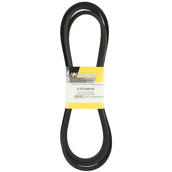 Belt, Mower Deck, Color: Black, Length: 147.75", Material: Polyester Cord, Notes: 5/8" x 147.75" Wrapped Polyester Cord, Thickness: 0.456", Type: Wrapped, Width: 5/8"