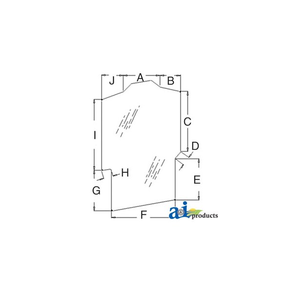 Glass, Windshield, Dim A (1): 10.00", Dim B (2): 6.00", Dim C (3): 27.00", Dim D (4): 3.00", Dim E (5): 11.50", Dim F (6): 20.00", Dim G (7): 15.25", Dim H (8): 4.50", Dim J (10): 6.00", Left Inlet: 22.50", Replaces: 428890A1