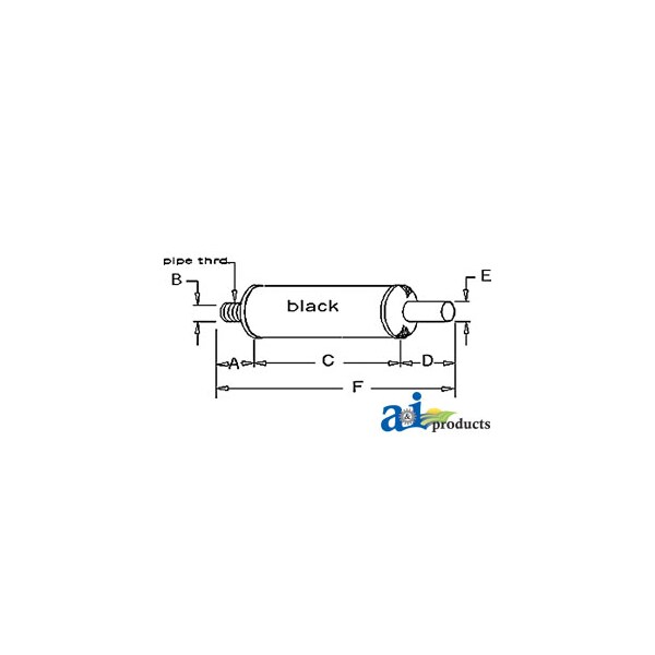 Muffler, Dim A (1): A: 3 1/4" INLET LENGTH, Dim B (2): B: 1" INLET I.D., Dim C (3): C: 5 1/2" SHELL LENGTH, Dim D (4): D: 1/2" OUTLET LENGTH, Dim E (5): E: 1" OUTLET O.D., Dim F (6): F: 9" OVERALL LENGTH, Notes: Horizontal / Round Body - 4 1/4" Shell Diameter