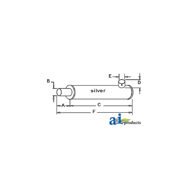 Muffler, Dim A (1): A: 2 1/4" INLET LENGTH, Dim B (2): B: 1 15/16" INLET I.D., Dim C (3): C: 12 1/2" SHELL LENGTH, Dim D (4): D: 2" OUTLET LENGTH, Dim E (5): E: 1 7/8" OUTLET O.D., Dim F (6): F: 15 1/2" OVERALL LENGTH, Notes: Horizontal / Round Body - 3 1/4" Shell Diameter (Used With102079A Extension Pipe