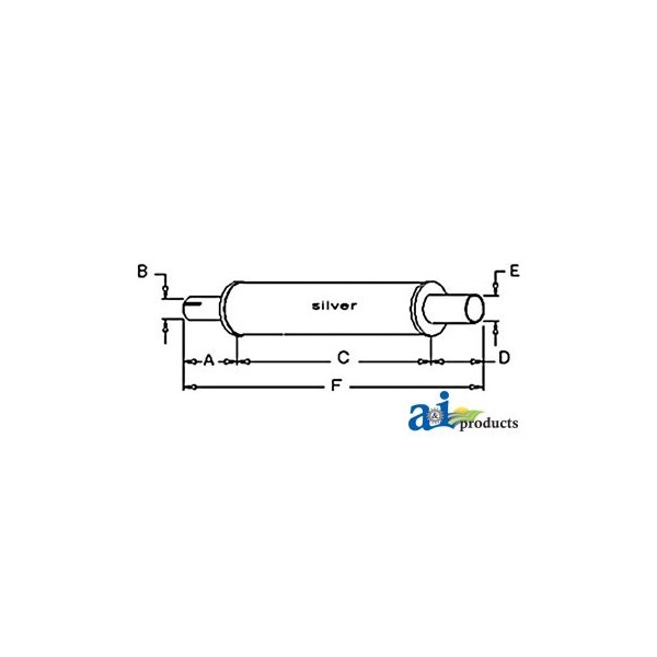 Muffler, Dim A (1): A: 2 3/4" INLET LENGTH, Dim B (2): B: 2 1/8" INLET I.D., Dim C (3): C: 13 1/2" SHELL LENGTH, Dim D (4): D: 2 1/4" OUTLET LENGTH, Dim E (5): E: 2 1/4" OUTLET O.D., Dim F (6): F: 18 1/2" OVERALL LENGTH, Notes: Horizontal / Round Body - 4 1/4" Shell Diameter