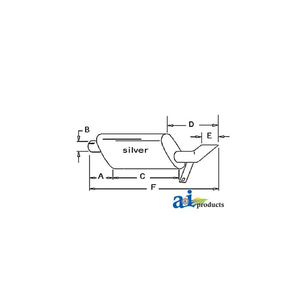Muffler, Dim A (1): A: 2 1/4" INLET LENGTH, Dim B (2): B: 1 3/4" INLET I.D., Dim C (3): C: 10 1/2" SHELL LENGTH, Dim D (4): D: 6 1/2" OUTLET LENGTH, Dim E (5): E: 1 3/4" OUTLET O.D., Dim F (6): F: 19 1/4" OVERALL LENGTH, Notes: Horizontal / Oval Body - 4" X 8" Shell Dimension. IncludesBracket & Bent Outlet Pipe