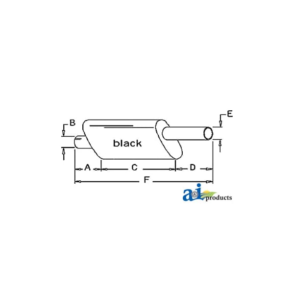 Muffler, Dim A (1): A: 2 1/2" INLET LENGTH, Dim B (2): B: 2" INLET I.D., Dim C (3): C: 16 1/2" SHELL LENGTH, Dim D (4): D: 3 1/2" OUTLET LENGTH, Dim E (5): E: 2" OUTLET O.D., Dim F (6): F: 22" OVERALL LENGTH, Notes: Vertical / Oval Body - 4 1/4" X 9" Shell Dimension. Use With O.E.M. Adapter AT11435T