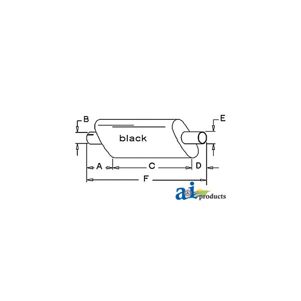 Muffler, Dim A (1): A: 2 1/2" INLET LENGTH, Dim B (2): B: 3 3/8" INLET I.D., Dim C (3): C: 14 1/4" SHELL LENGTH, Dim D (4): D: 2 3/4" OUTLET LENGTH, Dim E (5): E: 3 1/2" OUTLET O.D., Dim F (6): F: 19" OVERALL LENGTH, Notes: Vertical-oval body. Shell 9 1/2" x 5 1/2"