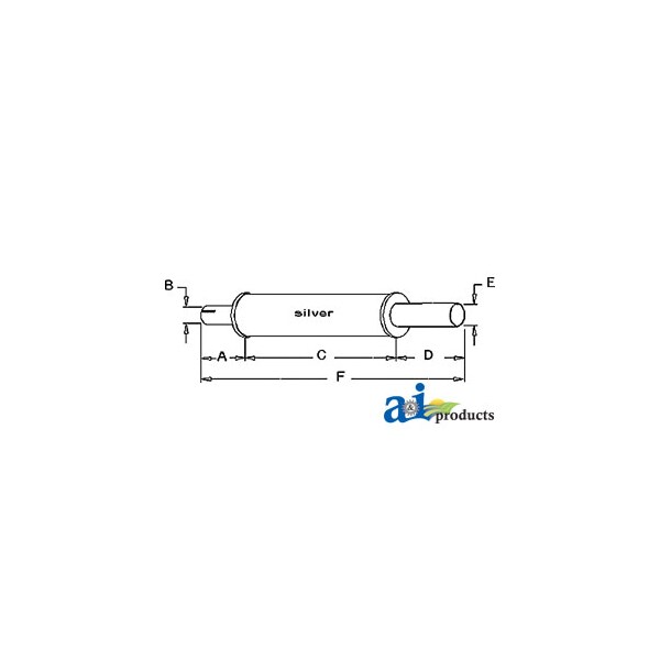 Muffler, Dim A (1): A: 2" INLET LENGTH, Dim B (2): B: 2 3/8" INLET I.D., Dim C (3): C: 14" SHELL LENGTH, Dim D (4): D: 5" OUTLET LENGTH, Dim E (5): E: 2 1/2" OUTLET O.D., Dim F (6): F: 21" OVERALL LENGTH, Notes: Vertical / Round Body - 6" Shell Diameter