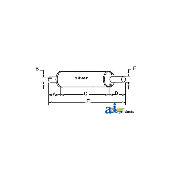 Muffler, Dim A (1): A: 3 1/2" INLET LENGTH, Dim B (2): B: 3 1/8" INLET I.D., Dim C (3): C: 14 1/2" SHELL LENGTH, Dim D (4): D: 3 1/2" OUTLET LENGTH, Dim E (5): E: 3" OUTLET O.D., Dim F (6): F: 22" OVERALL LENGTH, Notes: Vertical / Round Body - 6" Shell Diameter