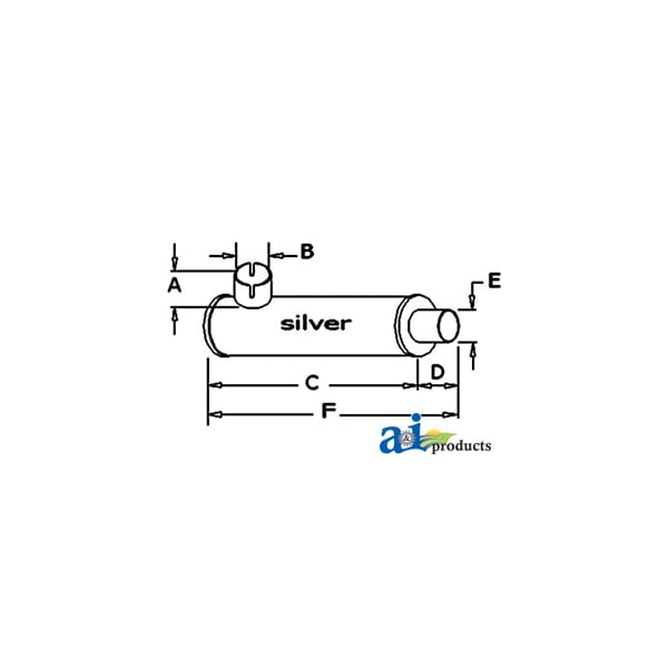 MUFFLER, Dim A (1): A: 1.812" INLET LENGTH, Dim B (2): B: 3.156" INLET I.D., Dim C (3): C: 19" SHELL LENGTH, Dim D (4): D: 2.375 OUTLET LENGTH, Dim E (5): E: 2.520" OUTLET O.D., Dim F (6): F: 21.750" OVERALL LENGTH