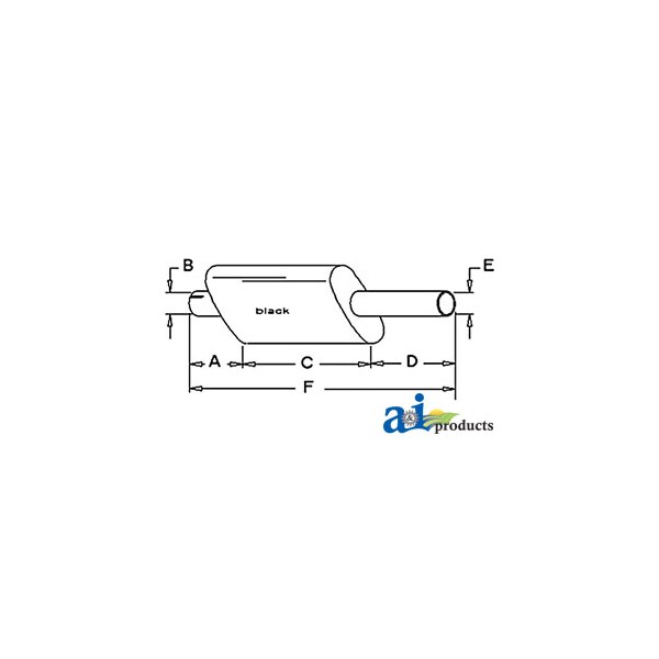 Muffler, Dim A (1): A: 2 3/4" INLET LENGTH, Dim B (2): B: 2 3/8" INLET I.D., Dim C (3): C: 16 1/4" SHELL LENGTH, Dim D (4): D: 15" OUTLET LENGTH, Dim E (5): E: 2" OUTLET O.D., Dim F (6): F: 34" OVERALL LENGTH, Notes: Vertical / Oval Body - 4 1/4" X 9" Shell Dimension