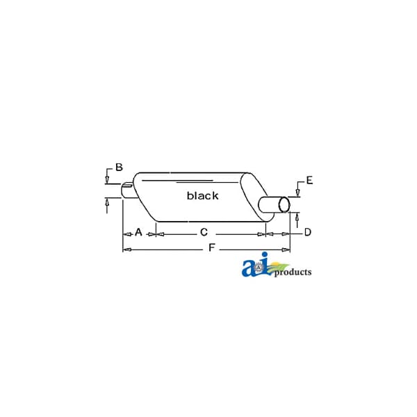 Muffler, Dim A (1): A: 5 1/4" INLET LENGTH, Dim B (2): B: 3 15/16" INLET I.D., Dim C (3): C: 23" SHELL LENGTH, Dim D (4): D: 3 1/2" OUTLET LENGTH, Dim E (5): E: 2 3/4" OUTLET O.D., Dim F (6): F: 32" OVERALL LENGTH