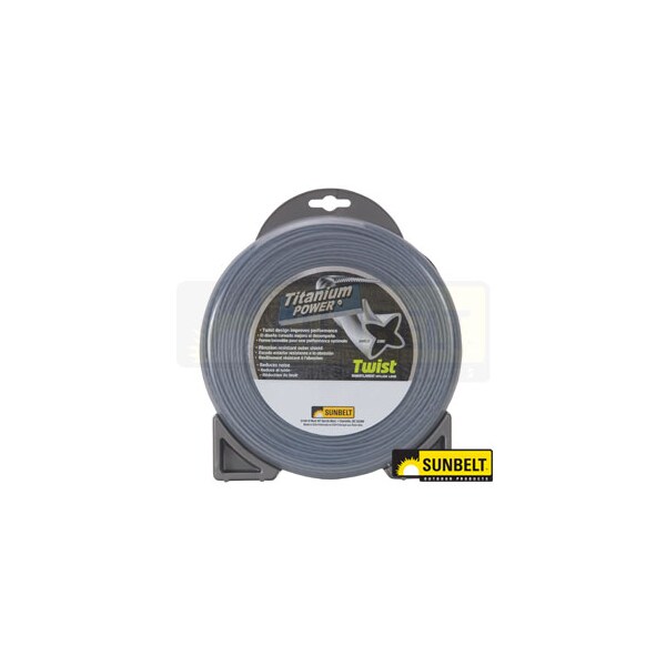 Titanium Power Trimmer Line, .130" twist, Diameter: .130", Notes 2: Developed through aerodynamic testing the Twist Line has outstanding air penetration reducing noise, Notes 2: pollution without compromising on performance., Notes 3: Noise isn't all that's reduced. With its concentrated strength, the Twist Titanium Power Line, Notes 3: requires less engine acceleration., Notes 4: on fuel costs and general wear and tear, increasing the life span of your trimmer., Notes 4: This makes it easier to cut grass, so your machine doesn't have to work at full power. You can save, Package: 1/2 lb. donut, Web Notes: field. Built with a tough core to minimize breakage, surrounded by an even tougher shell for, Web Notes: return. The Titanium Power trimmer line is a revolutionary new cutting monofilament combining two, Web Notes: and tear. This gives you a line that lasts 30% longer than traditional trimmer lines. You will have, Web Notes: durable materials for superior performance and longer life. WhatÜs the secret? The shield. Titanium, Web Notes: less breakage, less down time replacing line, and more cutting power for increased productivity., Web Notes: maximum strength. You invest a log in your lawn and garden equipment. ShouldnÜt you receive a lot in, Web Notes: Power encases the core material in a layer of 100% virgin resin that acts as a shield against wear, Web Notes: produced using a unique extrusion process. Extensive lab test verify such factors as impact and weld, Web Notes: State-of-the are manufacturing delivers the winning edge. The Titanium Power trimmer line is, Web Notes: Titanium Power trimmer line .130 in. diameter, 77 ft. twist trimmer Line. The toughest shield in the