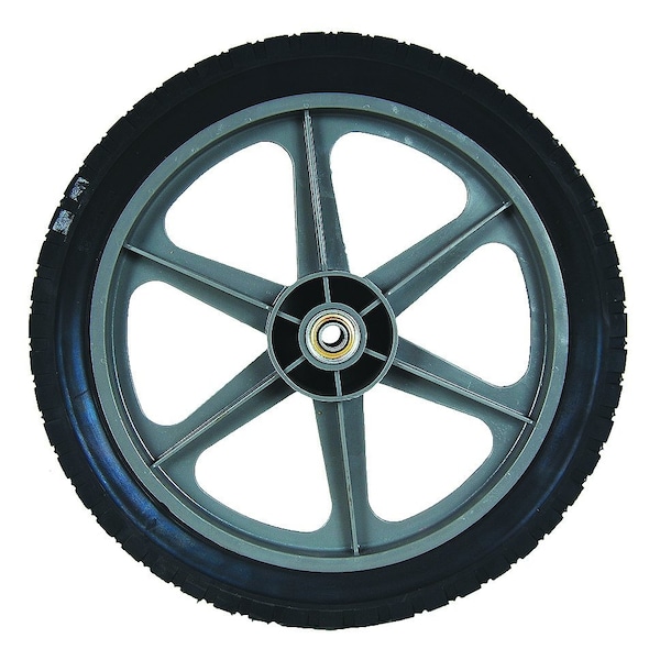 Wheel Assembly, Plastic (14 x 1.75), Center Hole: 1/2", Hub: 2-1/2", Centered Hub Type, Tread Pattern: Diamond, Bearing Type: Flanged Ball, Style: Deck Wheel, Wheel Color: Gray, : 14 x 1.75. 2-1/2" centered hub. 1/2" bearing. Universal gray spoke wheel. Diamond tread.