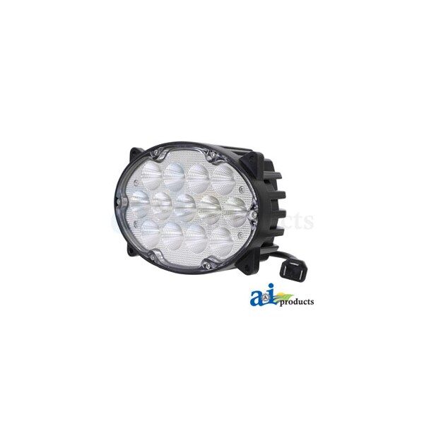 Work Lamp, LED, Flood, Hi / Low, Oval, Body Material: Die Cast Aluminum, Body: Oval, Color Temperature: 6000K, Dimensions: 6.34" (16.1cm) Width X 4.33" (11cm) Height X 3.54" (9cm) Depth, Diode: (13) 5 Watt Cree Diodes, Draw: 5.4 Amps @ 12 Volts & 2.7 Amps @ 24 Volts (Watts / Volts = Amps), Includes: Built in premium EMC noise suppression filter, Lens: Polycarbonate, Light Pattern: Flood - Hi / Low, Lumens Effective: 3,800 / 1,800, Lumens Raw: 6,000 / 2,800, Notes 2: Replacement for the front hood light on John Deere tractors and sprayers, Notes 3: Operating Temperature: -40 ~ 140 Fahrenheit /-40 ~ 60 Celsius, Notes: Replacement for the top of cab light on Case IH combines, Replaces: 87106352, 87106354, RE260102, RE173600, RE181963, Volt: 10-30 Volt DC