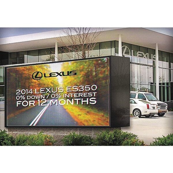 LED Message Display Sign, Number of Faces 1, Mounting Wall, Pole, Overall Height 35.8 in, Overall Width 81 13/64 in, Overall Depth 5 in, Display Height 2 ft 5.5 in, Display Width 6 ft 6.7 in, Character Height 9, Cabinet Material Aluminum, Number of Pixels Wide 96, Number of Pixels Tall 256, Physical Pitch 7.8mm, Full Color Color Options, Memory Storage 2 GB, Refresh Rate 30 Frames Per Sec., IP Rating IP14, Service Access Location Hinged Face, 10,000 hr LED Life Expectancy