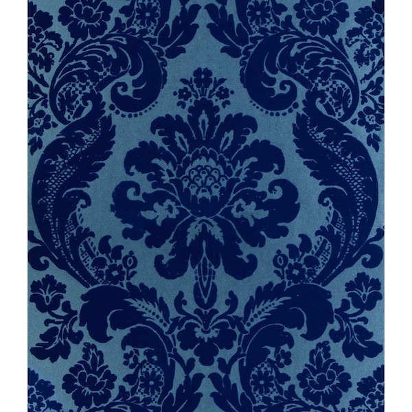 Shadow Blue Flocked Damask Wallpaper