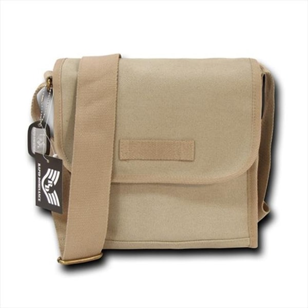 This Military Field Bag is an authentic military bag for carrying your personal items in a safe, secure, and unique way. The sturdy canvas contruction is strong yet flexible. A front flap covers three of the pockets and is held closed by a hook & loop closure. There are a total of 4 pockets - The (1) Front pocket, (2) Main pocket, a (3) Small zippered pocket within the main pocket, and a (4) Back pocket, also with a hook & loop closure. The front pocket is great for holding maps, tickets, or any other items that you may need quick access to. The main pocket is large enough to carry everyday items, including keys, bottle water, MP3 players, etc. The small zippered pocket is great for holding important items, such a coins, passports, etc. The back pocket is also useful for holding any items that you may need quick access to. The strap is fully adjustable and the 2 in. width makes the bag comfortable to wear. Antique brass details are used on the strap, which not only look good, but also adds to the durability of the bag.