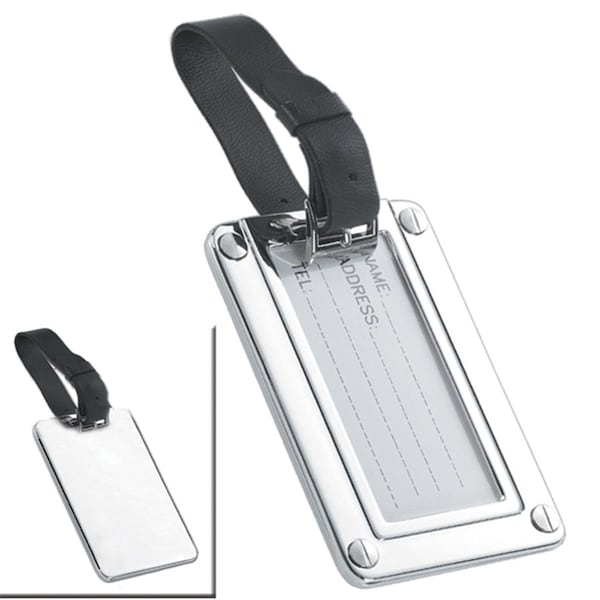 Spruce up any suitcase or attache with this elegant silver luggage tag with black strap.