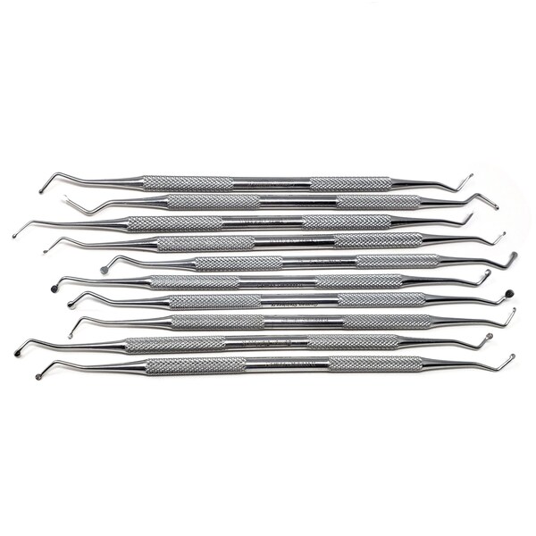 10 Pcs EXCAVATION SPOONS SET-Designed for cutting and removing the carious tissue of a decayed tooth. Before a filling can be placed, the decayed dentine near the pulp must be removed with a dental excavator.AFFORDABLE QUALITY MATERIALS-Made of high quality stainless steel for optimum utility, easy to sterilize, and fully autoclavable. Polished finish for aesthetic & rust corrosion resistance resulting from superior craftsmanship.KNURLED HOLDING SURFACE-Holding surface is knurled and textured for a firm grip even with wet hands. The corrugated handle design offers smooth maneuvering, giving you more control and access to tight areas. Ergonomically designed handle helps to promote neutral wrist posture when working on hard-to-reach areas.SPECIALIZED ORTHOPEDIC TOOL- Manufactured with small, medium or large excavators providing a selection to use depending on the cavity needing to be prepared. DOUBLE ENDED MICRO ENDS-Double-Ended hand held instruments shaped like a small sharp spoon targeted to clean out and shape a carious cavity before filling it.