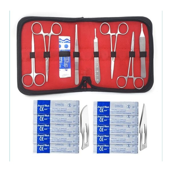 ALL IN ONE KIT: 28 Pcs Beginners Dissecting Kit comes with all in one instruments including Scalpel Knife Handle, Blades, Forceps, and Scissors. Everything you need to practice dissecting techniques and skills.PREMIUM QUALITY MATERIAL: These tools are manufactured using high quality, rust-free stainless steel, which is built to last repetitive use without degredation.CARRYING CASE: Everything packs away in our carryall case. A portable carrying case was created to be both useful and fashionable. Not only does it conveniently store suture instruments but a hidden pocket enables students to store and organize the contents for maximum convenience in class. EASY TO DISINFECT: Every tool is designed with specifications for maximum efficiency. The tools have smooth finish, preventing damage and irritation to your perforation, making it ideal for everyday use.IDEAL FOR SCIENCE LABS: This kit is equally suitable for teachers and students. An ideal for gift for beginners enrolled in biology, anatomy, medical, veterinary, physiology or home-schooled students.Kit Includes:1 Pcs Needle Holder1 Pcs Micro IRIS Dissecting Scissors1 Pcs Mosquito Hemostat Forceps Curved1 Pcs Mosquito Hemostat Forceps Straight1 Pcs Adson Tissue Forceps 1x2 Teeth1 Pcs Thumb Forceps1 Pcs Scalpel Handle No 3 with Measurement Scale10 Pcs Surgical Sterile Blades #10 - Individually Foil Wrapped10 Pcs Surgical Sterile Blades #11 - Individually Foil Wrapped1 Pcs Black Carrying Case