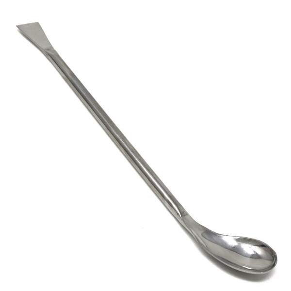 The offset, deep spoon end retrieves material from the corners of bottles and containers and the spatula end scrapes and breaks up caked powders.