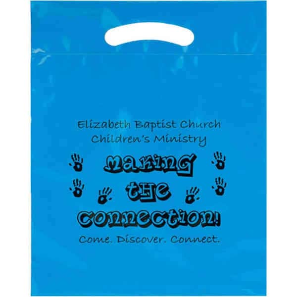 -Plastic bag with die cut fold-over reinforced handle with 3 gusset. -2.5 mil. low density film thickness. -Measures 15 x 19. -Material: Plastic. -Color: Blue. -Size: 15 x 19.