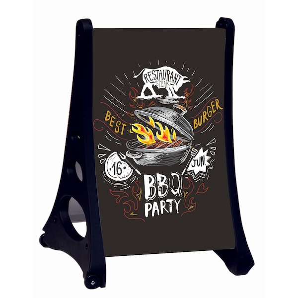 Roll A-Frames are a cost effective way to advertise. Convenient wheels and a curved design make these portable, lightweight frames an affordable solution for many different types of businesses. The Universal Channel Design allows any model to convert to a changeable poster holder, holding media up to 3/16" thick. Roll A-Frame double sided sidewalk board with Black Write On Boards. Board size 36"H x 24"W.