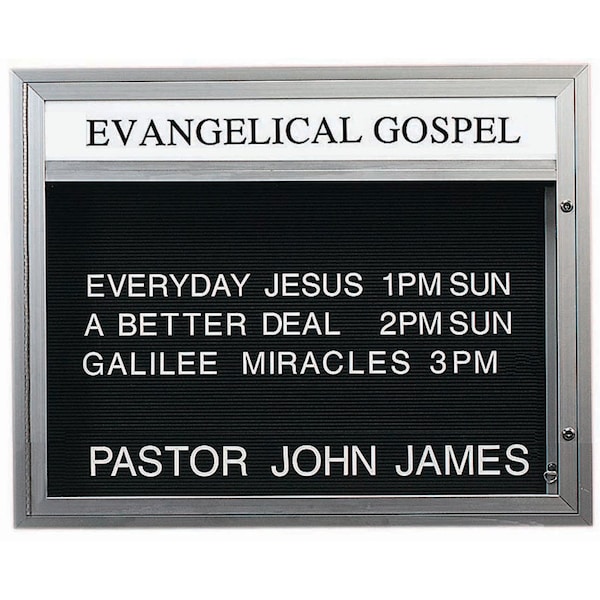 Single Sided Community Boards are ideal for religious, educational, and community buildings of all types for posting schedules, announcements, and messages that are clearly read and visible at night as well as during daytime hours. Units are constructed of solid extruded Aluminum and the black vinyl letter board are Removable for easy message changes. Headers are standard black Clear Gothic lettering on opaque white acrylic. Frame: Clear Satin Anodized Finish Size 33"Hx43"Wx4" Deep