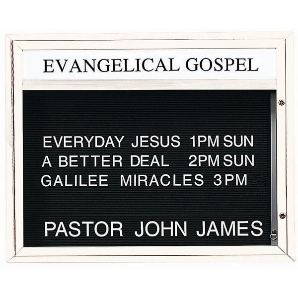 Single Sided Community Boards are ideal for religious, educational, and community buildings of all types for posting schedules, announcements, and messages that are clearly read and visible at night as well as during daytime hours. Units are constructed of solid extruded Aluminum and the black vinyl letter board are Removable for easy message changes. Headers are standard black Clear Gothic lettering on opaque white acrylic. Frame: White Powder Coated Finish Size 33"Hx43"Wx4" Deep
