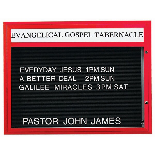Single Sided Community Boards are ideal for religious, educational, and community buildings of all types for posting schedules, announcements, and messages that are clearly read and visible at night as well as during daytime hours. Units are constructed of solid extruded Aluminum and the black vinyl letter board are Removable for easy message changes. Headers are standard black Clear Gothic lettering on opaque white acrylic. Frame: Red Powder Coated Finish Size 36"Hx47"Wx4" Deep