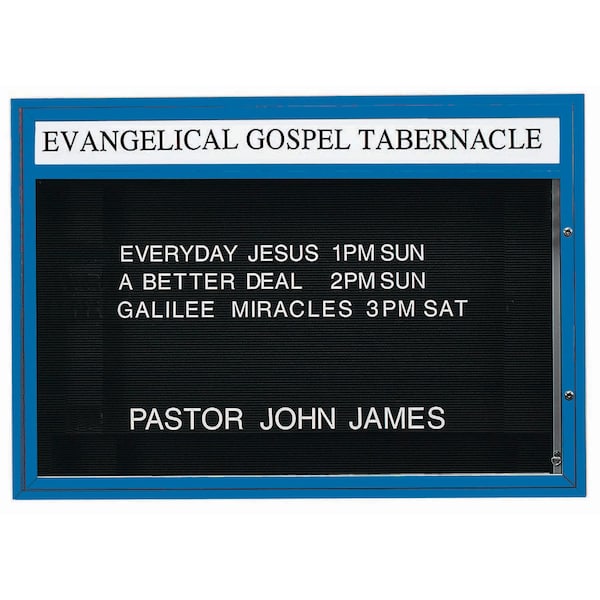 Single Sided Community Boards are ideal for religious, educational, and community buildings of all types for posting schedules, announcements, and messages that are clearly read and visible at night as well as during daytime hours. Units are constructed of solid extruded Aluminum and the black vinyl letter board are Removable for easy message changes. Headers are standard black Clear Gothic lettering on opaque white acrylic. Frame: Blue Powder Coated Finish Size 42"Hx60"Wx4" Deep