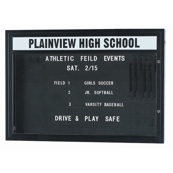 Single Sided Community Boards are ideal for religious, educational, and community buildings of all types for posting schedules, announcements, and messages that are clearly read and visible at night as well as during daytime hours. Units are constructed of solid extruded Aluminum and the black vinyl letter board are Removable for easy message changes. Headers are standard black Clear Gothic lettering on opaque white acrylic. Frame: Bronze Satin Anodized Finish Size 42"Hx60"Wx4" Deep