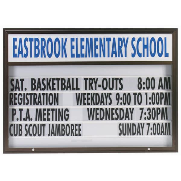 The "Marq Two" out door changeable sign is great for schools, fire houses, churches, municipal buildings, government buildings and any type of commercial establishment. Unit has a removable 5 line translucent letter board for easy message changes in a Heavy gauge Aluminum housing. Supplied with a blank header panel, ready for your custom vinyl lettering. Lettering is not included and must be applied by the customer. Frame Black Powder Coated Aluminum Size 52"Hx72"Wx8" deep.