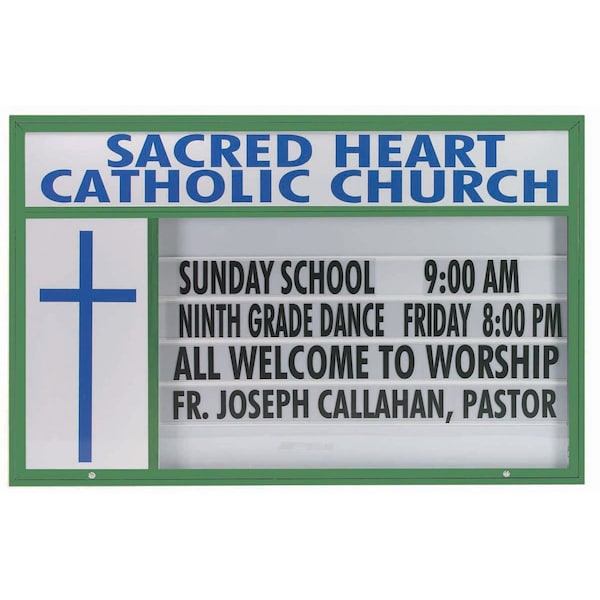 84 in W, 50 in H, White Translucent Letterboard/Forrest Green Powder Coated Frame