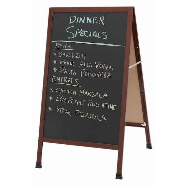 A-Frame Sidewalk Boards make great Menu Boards or POP signs that broadcast messages effectively. Great for restaurants, pubs, markets and retail stores. Frame is Cherry Wood-Look Powder Coated Aluminum surrounding a Black Composition Chalkboard. Size 42"Hx24"W.