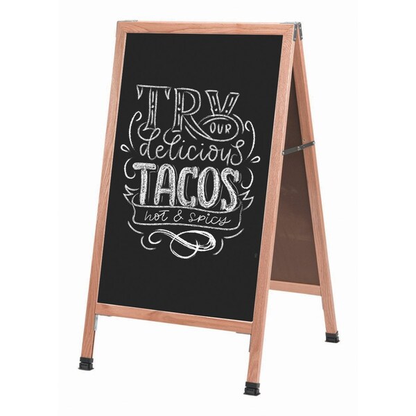 A-Frame Sidewalk Boards make great Menu Boards or POP signs that broadcast messages effectively. Great for restaurants, pubs, markets and retail stores. Frame is solid oak with a clear lacquer finish surrounding a Black Composition Chalkboard. Size 42"Hx24"W.