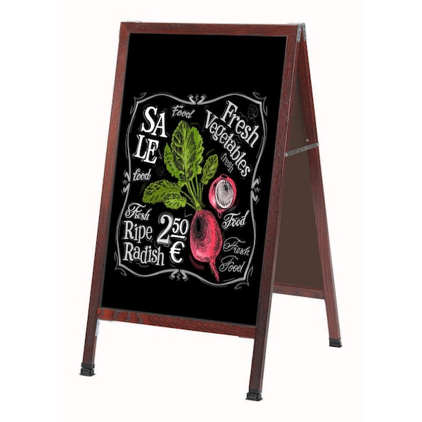 A-Frame Sidewalk Boards make great Menu Boards or POP signs that broadcast messages effectively. Great for restaurants, pubs, markets and retail stores. Frame is solid oak with a cherry finish surrounding a Black Composition Chalkboard. Size 42"Hx24"W.