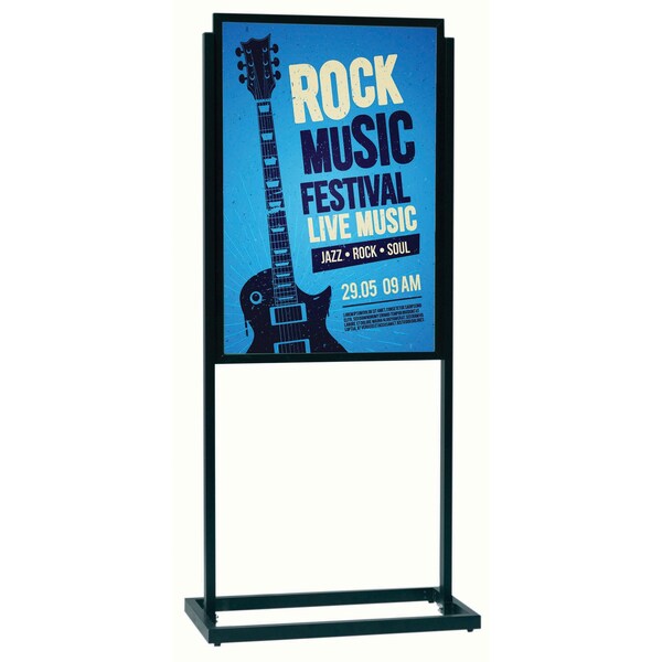 The "Boaster" freestanding double sided poster holder is 63"H x 24.5"W and holds two standard 22" x 28" posters. Black Powder Coated Finish.