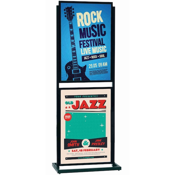 The "Double Boaster" freestanding double sided poster holder is 63"H x 24.5"W and holds four standard 22" x 28" poster. Black Powder Coated Finish.