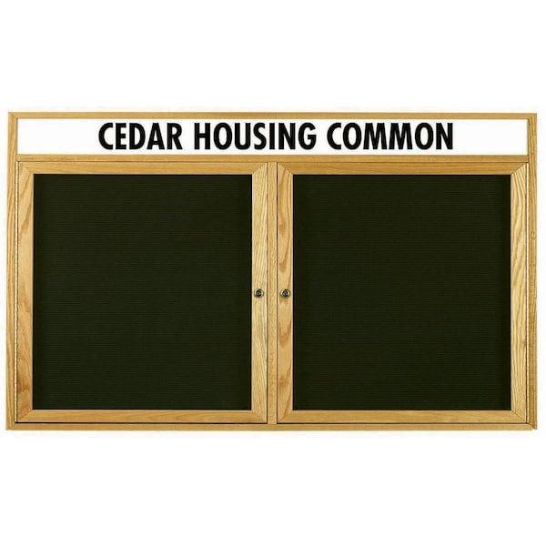Red Oak Enclosed Changeable Letter Boards are made of Solid North American Red Oak, and are milled to perfection with hairline miters at the corners sturdily fastened for a durable long life. Add your personalized inscription to the Header in Black cut vinyl letters in Clear Gothic typeface, on opaque acrylic. Black felt covered grooved letter panel accepts plastic letters with tabs positioned on 1/4" centers. Finish: High Gloss Clear Lacquer Size 36"Hx60"W 2 Doors