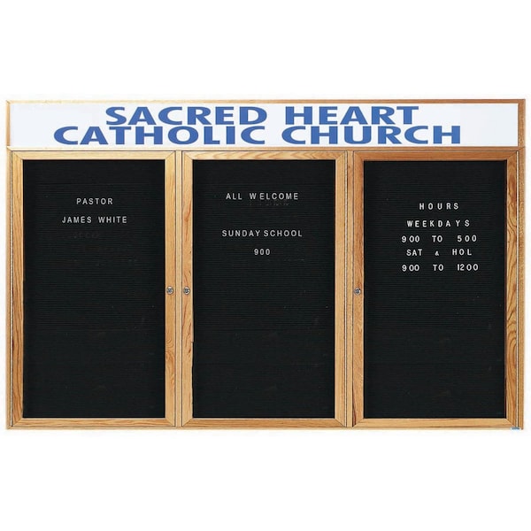 Red Oak Enclosed Changeable Letter Boards are made of Solid North American Red Oak, and are milled to perfection with hairline miters at the corners sturdily fastened for a durable long life. Add your personalized inscription to the Header in Black cut vinyl letters in Clear Gothic typeface, on opaque acrylic. Black felt covered grooved letter panel accepts plastic letters with tabs positioned on 1/4" centers. Finish: High Gloss Clear Lacquer Size 48"Hx96"W 3 Doors