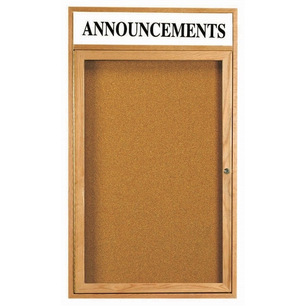 Red Oak Enclosed Bulletin Boards are made of Solid North American Red Oak, and are milled to perfection with hairline miters at the corners sturdily fastened for a durable long life. Supplied with a blank header panel, ready for your custom vinyl lettering. Lettering is not included and must be applied by the customer. The neutral Natural Pebble Grain Cork back panel easily blends with any decor. Finish: High Gloss Clear Lacquer Size 36"Hx24"W 1 Door