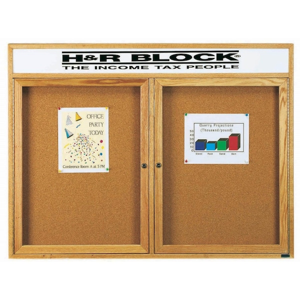 Red Oak Enclosed Bulletin Boards are made of Solid North American Red Oak, and are milled to perfection with hairline miters at the corners sturdily fastened for a durable long life. Supplied with a blank header panel, ready for your custom vinyl lettering. Lettering is not included and must be applied by the customer. The neutral Natural Pebble Grain Cork back panel easily blends with any decor. Finish: High Gloss Clear Lacquer Size 36"Hx48"W 2 Doors