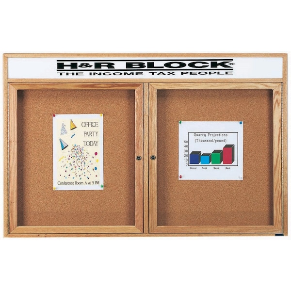 Red Oak Enclosed Bulletin Boards are made of Solid North American Red Oak, and are milled to perfection with hairline miters at the corners sturdily fastened for a durable long life. Supplied with a blank header panel, ready for your custom vinyl lettering. Lettering is not included and must be applied by the customer. The neutral Natural Pebble Grain Cork back panel easily blends with any decor. Finish: High Gloss Clear Lacquer Size 36"Hx60"W 2 Doors